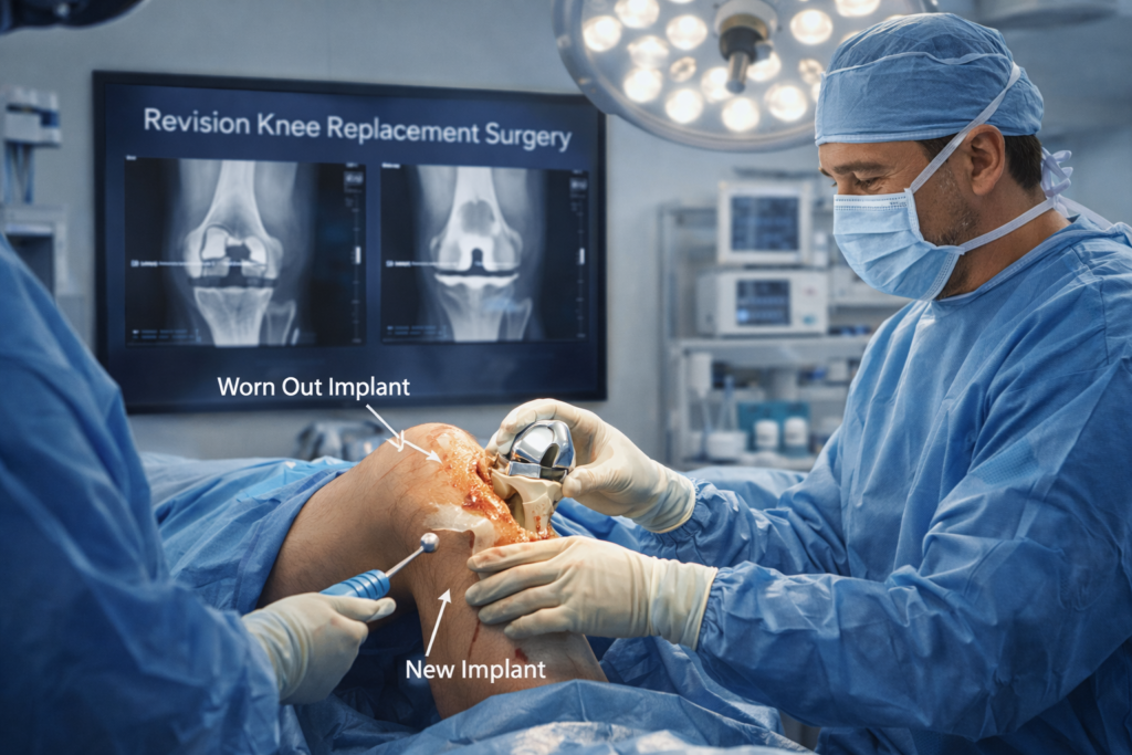 Revision knee replacement surgery is performed when a previously replaced knee joint develops problems such as pain, instability, stiffness, infection, implant loosening, or wear over time.